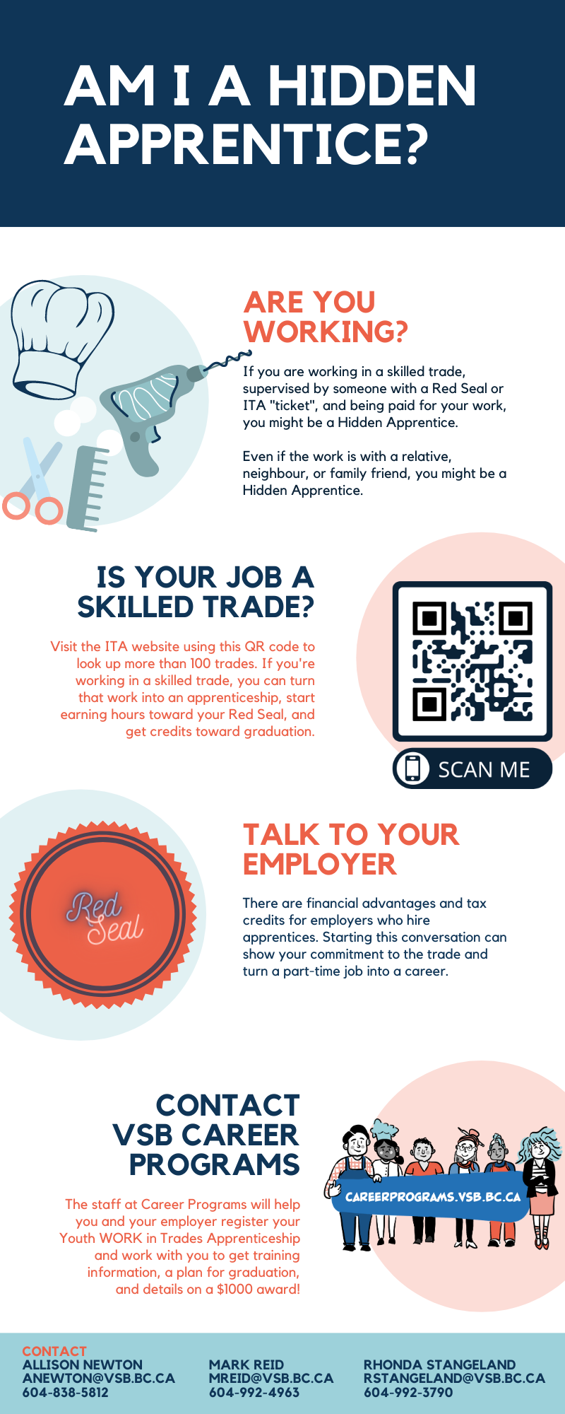 Students considering an apprenticeship in a construction trade could contact careerprograms@vsb.bc.ca and ask to be enrolled in the BC Construction Safety Alliance SiteReady construction safety course. Instructions on completing the registration process for SiteReady are available here.