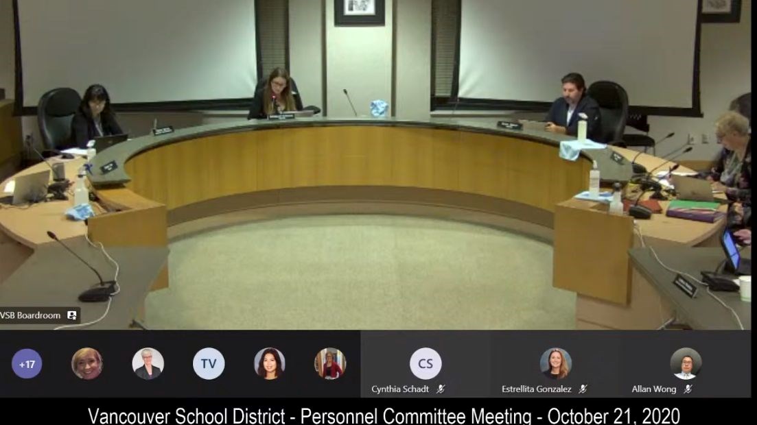 The Personnel Committee meeting began with delegations regarding a motion on anti-racism training for all employee groups in the District. The committee heard from three delegations – including a member of the Canadian Union of Public Employees Local 15 and parents from Vancouver school communities. A discussion period followed, where trustees thanked each speaker for sharing their thoughts and stories.