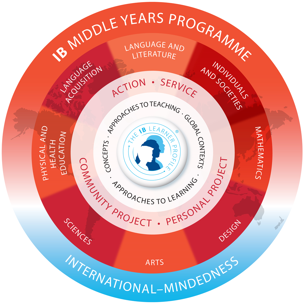The Middle Years Program (MYP) is an educational framework that requires students to study in eight subject areas (Language and Literature, Mathematics, Individuals and Societies, Science, Language Acquisition, Arts, Physical Education and Design) in each year of the MYP program. The BC curriculum is the basis for each subject’s content. Teachers present the curriculum focused through the MYP’s Global Contexts. In this way Instructional Strategies change rather than course content. The diagram represents the MYP curriculum model.